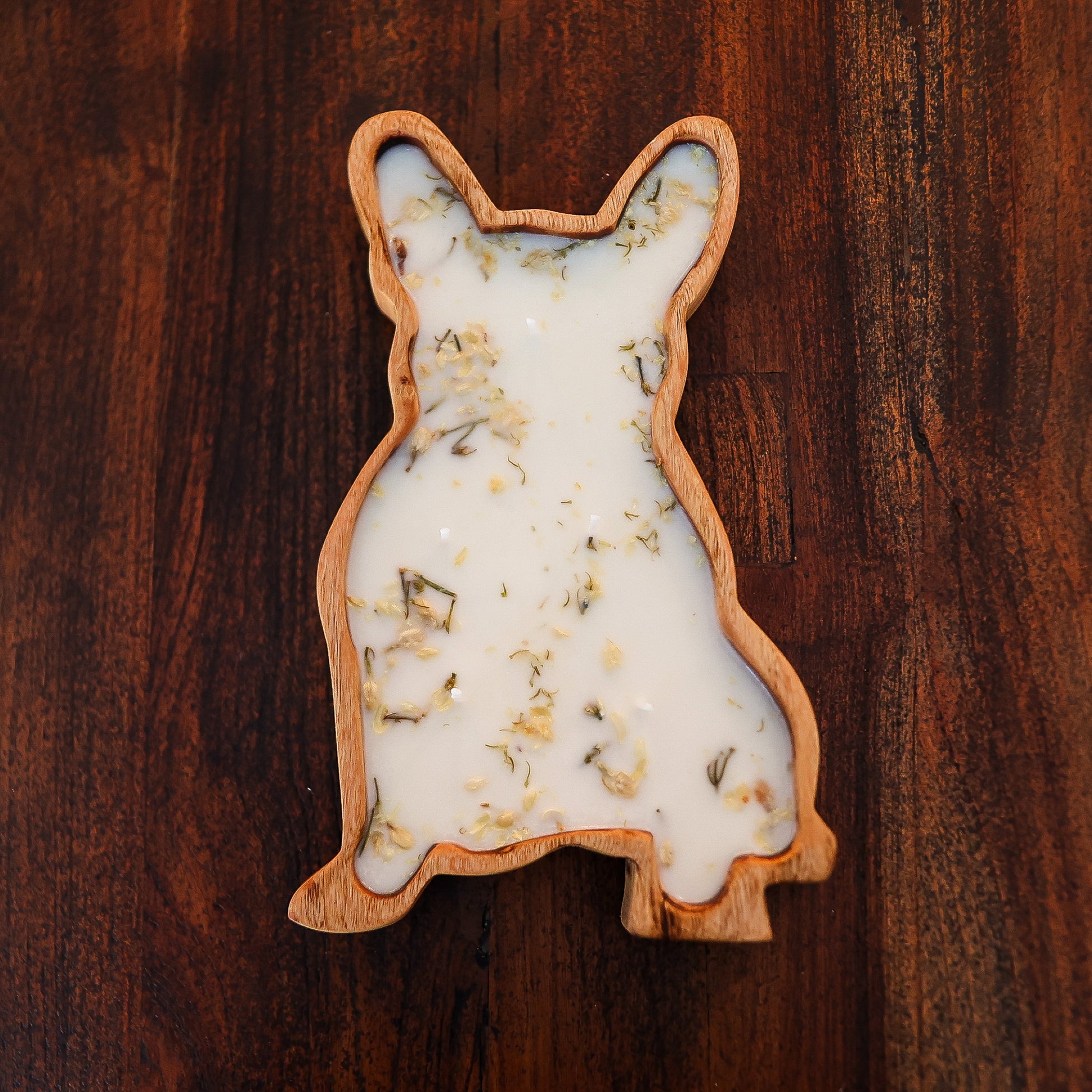 This Frenchie Doughbowl Candle is a playful, handcrafted piece poured into a carved wooden bowl shaped like a French bulldog. Each bowl is currently being made and offered as a limited pre-order.